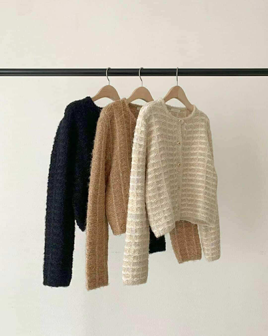 以立體感編織紋理搭配微微閃光的質地,展現低調卻精緻的氣質。布料手感柔軟,穿起來不厚重,穿上後散發出一種安靜,優雅的氣質感。